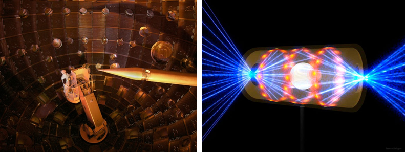 En el confinamiento inercial una pequeña pastilla de combustible se comprime y se calienta mediante un rayo láser de elevada energía de tal forma que la fusión ocurre antes de que los átomos puedan separarse. El objetivo del NIF de estados Unidos es alcanzar la fusión por compresión y calentamiento de una pequeña cápsula de deuterio y tritio utilizando la energía de 192 rayos láser de elevada energía. En este proceso la cápsula de combustible se comprimirá alcanzando una densidad 100 veces mayor que la del plomo sólido y se calentara a más de 100 millones de grados centígrados. En la etapa de compresión los rayos X generados por la irradiación del láser ceden su energía a la parte exterior de la esfera que rápidamente se expande hacia el exterior. Esto produce que el resto del combustible se mueva hacia al interior formando una estructura densa uniforme. Para producir la ignición será necesario un segundo pulso que transfiera 20 kJ de energía en un punto de 35 micras de tamaño en unos pocos picosegundos, calentando el combustible hasta la temperatura de de ignición e iniciando la reacción termonuclear.