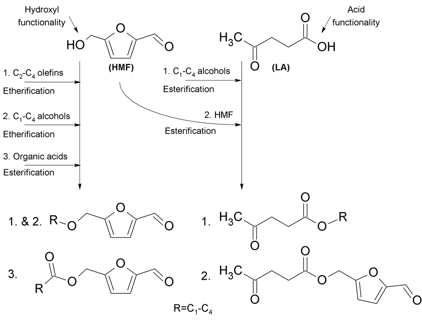 Diferentes grupos de investigación dedican sus esfuerzos al diseño de procesos y catalizadores que permitan la tranformación de la biomasa lignocelulósica en biocarburantes de elevada densidad energética de una forma sostenible y eficiente. Para ello, en primer lugar es ncesario la transformación de los polisacáridos (celulosa y hemicelulosa) presentes en la biomasa lignocelulósica en moléculas base de elevado valor añadido: furfural, 5-hidroximetilfurfural (HMF) y ácido levulínico (LA). Posteriormente, estas moléculas mediante diferentes transformaciones químicas dan lugar a diferentes compuestos que han mostrado ser buenos candidatos para la formulación de los combustibles convencionales de automoción (ver esquema adjunto).