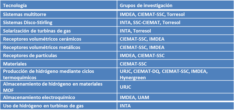 En la siguiente tabla (tabla 1) pueden verse todas las Tecnologías que se están desarrollando dentro del Programa SOLGEMAC y los grupos de investigación que participan de su desarrollo.