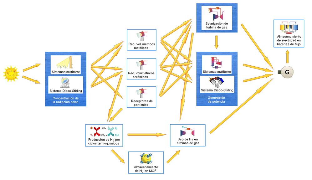 Cada uno de estos organismos dedica su actividad investigadora al desarrollo de un aspecto tecnológico específico de las centrales solares termoeléctricas: sistemas de concentración, receptores, acumuladores, etc. Cada grupo está encargado de desarrollar un esquema tecnológico diferente en base a un componente concreto de la planta. A pesar de la disparidad tecnológica, todos los esquemas están enfocados a la consecución de un objetivo común: la mejora de la modularidad, la eficiencia y la gestionabilidad de la planta.