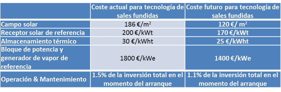 Por todo ello, y asumiendo los valores que se creen que son posibles debido a mejoras en los procesos de fabricación, a una mayor madurez de la industria, y a una economía de escala, los siguientes costes son asumidos como posibles y viables en las próximas generaciones de plantas termosolares de receptor central;