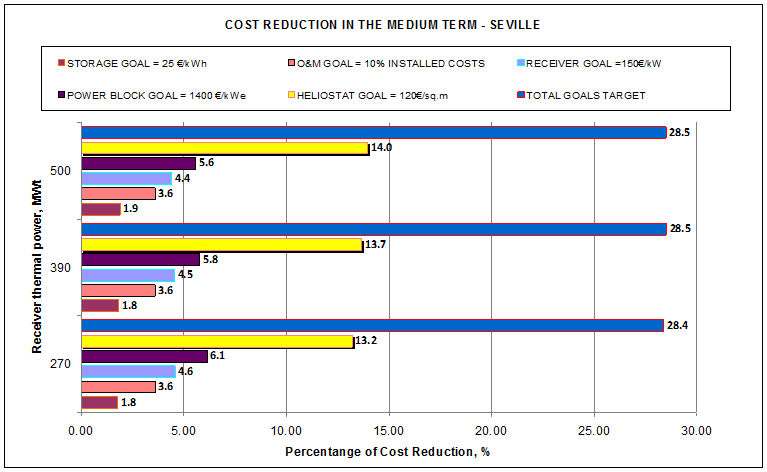 Para Sevilla, el coste de la electricidad de un receptor de referencia de 270MWt es de 21.020 c€/kWh y de 20.372 c€/kWh para un receptor de 500 MWt. Estos costes pueden reducirse hasta 15.053 (270 MWt) – 14.567 (500 MWt) c€/kWh, lo que implica una reducción de entre un 28.39 y 28.52%.