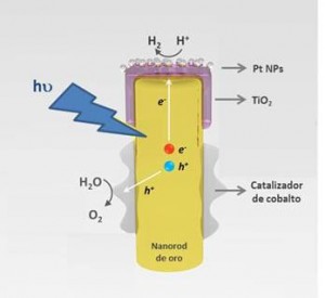 El sistema catalítico diseñado en el estudio consta de un conjunto de nanorods de oro cubiertos por una capa de material semiconductor (TiO2) decorado en superficie con nanopartículas de platino. La irradiación del oro provoca la aparición del plasmón superficial y por tanto, que los electrones excitados en el metal se puedan transferir a lo largo de los nanorods hasta el semiconductor. Una vez allí las nanopartículas de platino actúan como aceptores de electrones, capturándolos para que estén disponibles para la formación de H2y no se consuman en procesos de recombinación con los huecos también generados. Los huecos a su vez son empleados por un catalizador basado en cobalto, depositado en la parte inferior del sistema, responsable de la formación de oxígeno. La Figura 1 muestra una adaptación del esquema del sistema catalítico empleado.