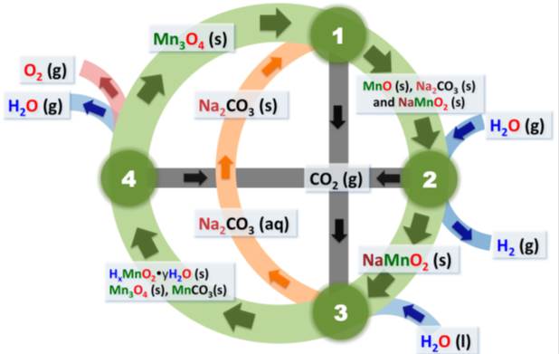 En el esquema se observa cómo en una primera etapa, el Mn3O4 reacciona con carbonato para producir el óxido mixto NaMnO2 y MnO (1), formado a partir de la disociación del Mn2+ presente en la espinela Mn3O4. Posteriormente, el MnO junto con el Na2CO3 restante reaccionan con el H2O para producir hidrógeno y NaMnO2 a 850ºC(2). En la siguiente etapa, el óxido mixto formado se descompone mediante la extracción del Na+ de la estructura, empleando H2O a 80ºC, (3), formando materiales libres de sodio como el carbonato de manganeso y Mn3O4 inicial. Finalmente estos materiales se calcinan a 850ºC para recuperar todo el óxido de partida (4) mientras que el carbonato de sodio extraído es recirculado a la etapa de producción de hidrógeno (1), previa etapa de evaporación del agua.