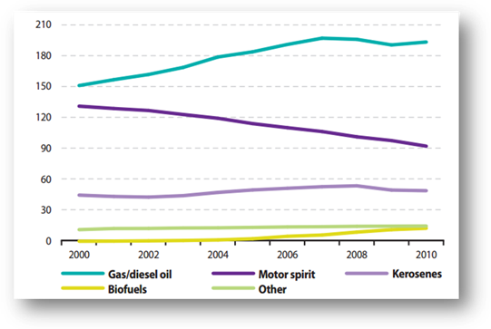 Figura 1.Consumo de energía en el sector del transporte por tipo de combustible en la UE-27 (Mton). Fuente: Eurostat