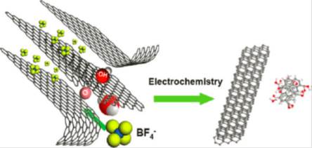 En ese primer estudio se usó un método directo y sencillo para producir grafenos a partir de grafito en mezclas de líquido iónico (IL)/agua en las que los radicales hidroxilo y oxígeno producidos por oxidación anódica del agua empiezan la oxidación del grafito en sus escalones, facilitando a su vez la intercalación de aniones procedentes del líquido iónico. La alta constante dieléctrica del IL impide las interacciones de van der Waals entre capas que inducen el agrupamiento de grafenos y dan lugar a grafenos con propiedades eléctricas sin deteriorar.4 Estudios más recientes han obtenido grafeno por exfoliación electroquímica de grafito pirolítico altamente orientado (HOPG) en medio acuoso ácido,5 permitiendo vislumbrar una reducción drástica de costes en estos procesos.