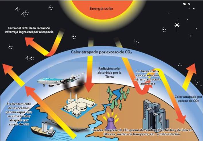 Estos llamados gases de efecto invernadero (GEI), atrapan el calor en la atmósfera. Así, cuando la radiación solar llega a la superficie dela Tierra, una parte es absorbida y otra reflejada, pasando de nuevo por la atmósfera y saliendo al espacio. Los GEI, permiten que esta radiación entre a la atmósfera pero ya no dejan que salga, provocando una retención de la energía que hace que la temperatura media de la superficie terrestre aumente.