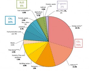 Una visualización resumida que clarifica la participación a nivel mundial de las diferentes fuentes de emisiones de gases de efecto invernadero (CO2 e), por sector y tipo de gas (datos de 2010), se muestra en el siguiente diagrama.