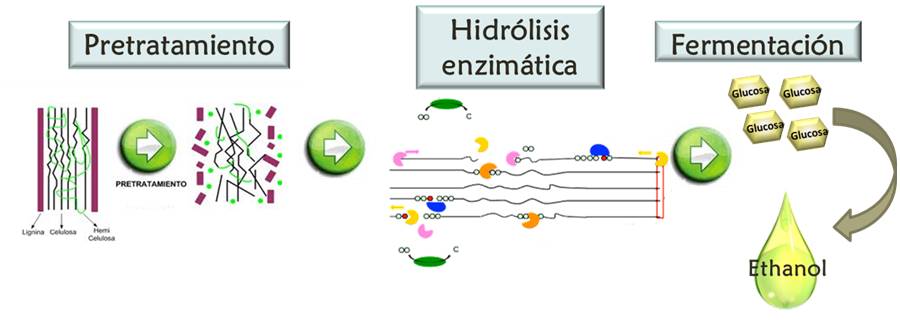 A pesar de los enormes avances realizados en los últimos años en las tecnologías de producción de etanol lignocelulósico, siguen existiendo obstáculos que dificultan su comercialización ya que se trata de un proceso complejo, que consta de diferentes etapas: (1) el pretratamiento, que facilita la accesibilidad de las enzimas, (2) La hidrólisis enzimática, donde los azúcares complejos contenidos en la biomasa serán liberados en forma de azúcares simples, (3) etapa de fermentación, en la cual los azúcares liberados durante la hidrólisis enzimática son transformados a etanol por una microorganismo fermentativo (bacterias o levaduras).