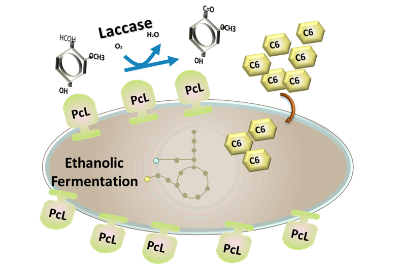 No obstante, durante la etapa de pretratamiento se generan diferentes compuestos, tales como derivados del furano, ácidos débiles y compuestos fenólicos, que actúan como inhibidores del organismo fermentador y por lo tanto inhibiendo el proceso de conversión de azúcares a etanol. Una de las posibles estrategias para evitar la inhibición del organismo fermentador es la adición de enzimas detoxificadoras tales como las lacasas durante la etapa de hidrólisis enzimática. Las lacasas son enzimas oxidorreductasas que oxidan a los compuestos fenólicos utilizando como aceptor de electrones al oxígeno molecular. La adición de lacasas de forma externa elimina los compuestos fenólicos generados tras el pretratamiento y permite por tanto aumentar la viabilidad de los organismos fermentadores y aumentar los rendimientos de producción de etanol. Sin embargo, el uso externo de lacasas incrementa los costes del proceso de producción de etanol haciendo inviable su aplicación directa a gran escala.