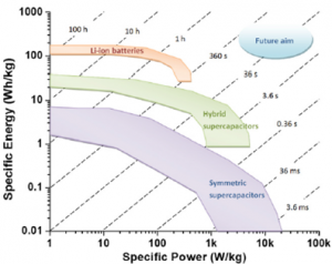 Figure 1. Ragone plot of energy vs. power for batteries and Supercapacitors