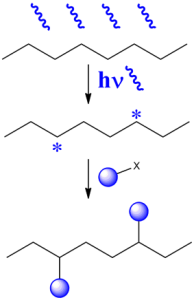 - En la primera se crean sitios activos sobre un polímero base de propiedades químicas y mecánicas adecuadas para nuestro propósito. Para ello, el polímero es irradiado con fuentes de alta energía, como pueden ser rayos X, rayos γ, electrones, plasma, partículas β… para así inducir la ionización de la matriz polimérica.