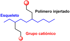 Figura 2. Esquema de un polímero de injerto con grupos catiónicos que permiten la movilidad de iones OH–.