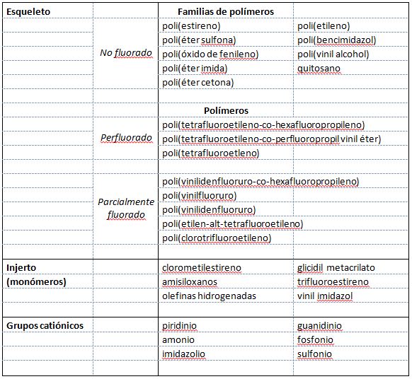 En la revisión bibliográfica publicada recientemente por Zhou y colaboradores [4] se describen distintos procesos de síntesis de membranas poliméricas empleando este tipo de métodos. Para ver el amplio abanico de posibilidades aquí se muestra la Tabla 1, donde se indican distintos polímero de partida (el esqueleto), el polímero injertado, y el grupo catiónico que permite la movilidad de aniones a través de la membrana (ver Figura 2). Las combinaciones de estos tres elementos permiten obtener gran número de membranas de intercambio aniónico potencialmente aptas para su uso en pilas de combustible de alcohol directo. Los principales requisitos que deben cumplir son: