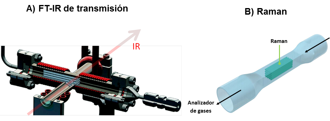 El grupo de Espectroscopia y Catálisis industrial (SpeICat) del ICP-CSIC, con amplia experiencia en la metodología operando y en el desarrollo de catalizadores monolíticos, en colaboración con el Laboratoire Catalyse et Spectrochimie (LCS) de la ENSI de Caen, ha estado desarrollando en los últimos años nuevas celdas de reacción para expandir el enfoque operando a la caracterización de monolitos por espectroscopia vibracional durante su funcionamiento como catalizadores. En 2012 desarrolló una celda que permite caracterizar monolitos por FT-IR en transmisión,2 como se muestra en la figura 1, y en un artículo recién publicado en la revista Catalysis Science & Technology3 presenta un reactor monolítico monitorizado por microscopía Raman, en lo que son los primeros intentos de estudios operando de monolitos mediante espectroscopia vibracional. La espectroscopia vibracional proporciona informacion molecular: la espectroscopia infrarroja (IR) es esencialmente sensible a vibraciones que impliquen un cambio en el momento dipolar (modos asimétricos), y la espectroscopia Raman, a vibraciones que impliquen un cambio en la polarización (modos simétricos). En consecuencia, para catalizadores tipo óxido soportado, la primera se emplea generalmente para estudiar especies adsorbidas e hidroxilos superficiales mientras que la segunda se emplea para principalmente para estudiar el propio catalizador.