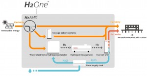 Los paneles solares instalados en los techos de los trenes generan electricidad, que se utiliza para producir posteriormente hidrógeno. Ese hidrógeno es almacenado en el tanque y, en el momento de un desastre natural, por ejemplo un terremoto, es utilizado para generar electricidad con las pilas de combustible, suficiente para abastecer a la estación de trenes. En situación normal, el sistema puede abastecer electricidad y controlar de una forma óptima la cantidad de hidrógeno producido, la electricidad almacenada y generada, etc.