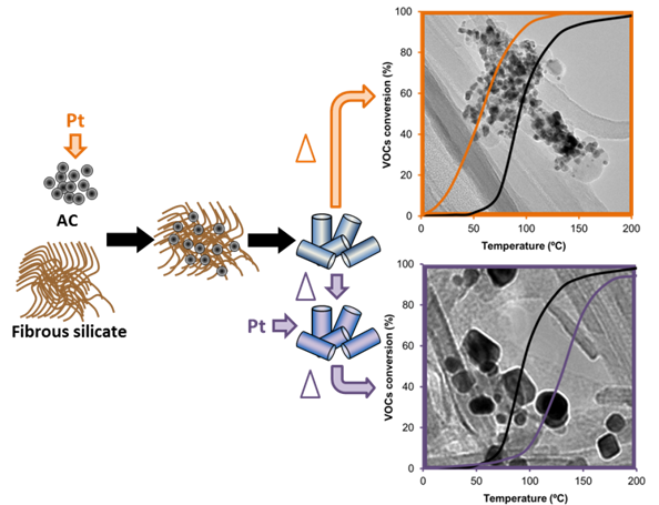 Figura 1. Esquema resumen de la preparación de catalizadores extruidos basados en platino sobre sepiolita, y del efecto que tienen el carbón activado y el método de impregnación en la porosidad, dispersión y actividad oxidativa. La curva negra de actividad, referencia, es la obtenida sin emplear CA. La curva violeta y la micrografía correspondiente (abajo) son las obtenidas cuando se emplea CA en la extrusión pero se impregna el material una vez consolidado; en ausencia de un óxido metálico como soporte la macroporidad favorece la formación de aglomerados. La curva naranja representada sobre su micrografía (arriba) se obtiene pre-impregnando el CA (método ICP), con lo que se simplifica la preparación y se favorece la dispersión. Ver el artículo completo en 4.