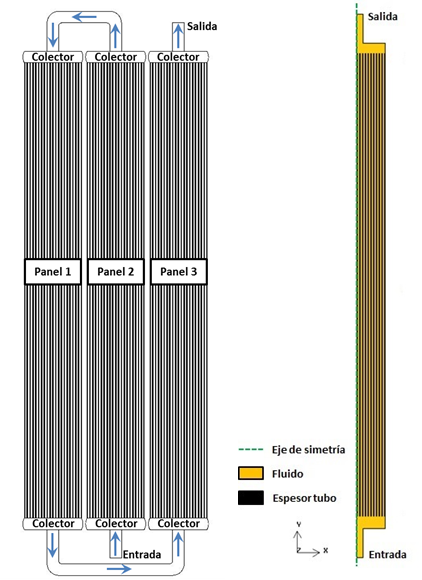 Con el fin de integrar nuevos fluidos térmicos en plantas termosolares, el proyecto AlcConES, financiado por la Comunidad de Madrid, contempla como actividad el estudio de las condiciones de operación para el uso del s-CO2 en receptores solares de torre. En concreto, el Centro de Investigaciones Energéticas, Medioambientales y Tecnológicas (CIEMAT) está realizando un análisis de dichas condiciones de operación para un receptor tubular de torre que emplea este fluido supercrítico como medio de transferencia de calor. Para ello, se ha desarrollado un modelo de simulación, mediante la Fluidodinámica Computacional, aplicado a un diseño anterior creado para el uso de sales fundidas y validado con resultados experimentales obtenidos a partir de la puesta en marcha y ensayo del sistema. Dicho diseño consta de distintos grupos de tubos metálicos, dispuestos en tres paneles, por los que circula el fluido de trabajo [6] (Figura 1a).