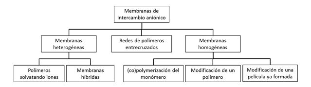 Dentro de las pilas de combustible, las que se utilizan en el rango de baja temperatura (entre temperatura ambiente y 100ºC aproximadamente) se dividen en dos tipos, dependiendo de la carga de los iones que conduzcan a través de la membrana3: pilas de combustible con membranas de intercambio protónico (PEMFCs por sus siglas en inglés de proton Exchange membrane fuel cells) y pilas de combustible con membranas de intercambio alcalinas (AEMFCs por sus siglas en inglés de alkaline exchange membrane fuel cells). Las pilas de combustible alcalinas presentan ventajas importantes como unas mejores cinéticas de reacción para la reducción del oxígeno y el uso de catalizadores basados en metales no nobles con la reducción de costes que esto conlleva; a pesar de ello tienen en contra que a día de hoy aun no tienen una potencia comparable a las PEMFCs principalmente por tener menor conductividad iónica a través de la membrana. Para superar esta barrera en la actualidad se está estudiando como sintetizar membranas con mejores conductividades, manteniendo una buena estabilidad en medio alcalino y adecuadas propiedades mecánicas para poder soportar las condiciones de uso en la celda de combustible. Otras funciones que deben cumplir las membranas, además de la rápida conducción de los iones, son ser aislantes eléctricamente para separar de forma efectiva el cátodo del ánodo, presentar en menor cruce de flujos posible de combustible y corriente oxidante y ser lo más fina posible (aproximadamente entre 50 y 80μ). En la actualidad hay muchos tipos de membranas alcalinas distintos, la mayoría de los cuales son descritos a continuación atendiendo especialmente a su estructura final. La mayoría de las membranas alcalinas pueden ser clasificadas dentro de los tres siguientes grupos4: membranas heterogéneas, redes de polímeros entrecruzados y membranas homogéneas.