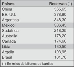 Tabla 1. Reservas probadas de hidrocarburos no convencionales susceptibles de ser explotados mediante la tecnología de fractura hidráulica.