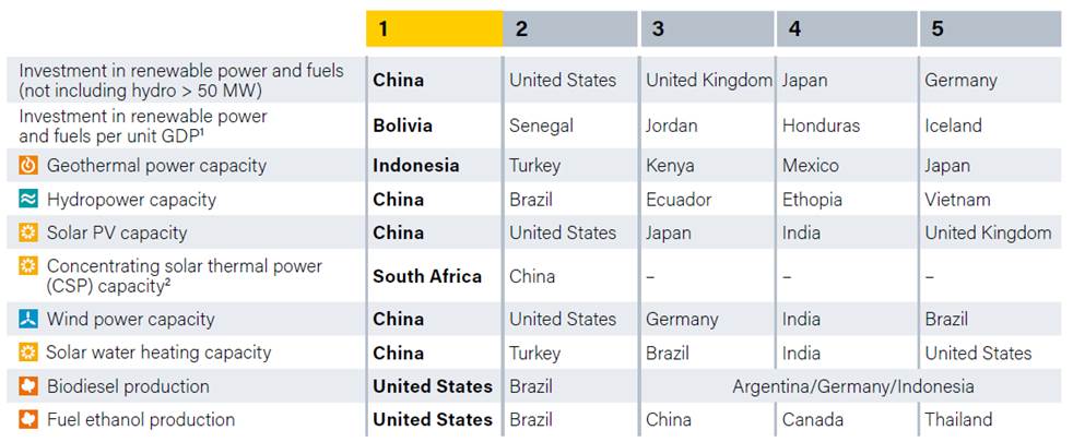 La instalación de nuevas plantas de generación eléctrica de fuentes renovables alcanzó un nuevo récord en 2016, con un total 161 GW que aumentan la capacidad total instalada en un 9% con respecto al año anterior. La tecnología con mayor aumento es la solar fotovoltaica, que supone un 47% de las nuevas instalaciones, a la que siguen la eólica (34%) e hidráulica (15,5%). Además, es el quinto año consecutivo en el que la inversión en energías renovables duplica la de generación por combustibles fósiles. Los países que más han invertido en generación renovable son China y Estados Unidos aunque si se normaliza según el producto interior bruto pasan a serlo Bolivia y Senegal. En la Figura 1 se muestra esta clasificación global junto con la clasificación por tecnologías.