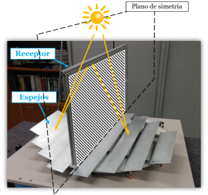 En cuanto a la superficie reflectante, anteriores estudios han demostrado que el uso de espejos curvos es necesario de cara a obtener rendimientos ópticos concentraciones relativamente altos con un número limitado de espejos3. Sin embargo, la adquisición de espejos curvos con curvaturas específicas conlleva un alto coste. Por ello, se ha ideado un mecanismo para instalación de espejos curvos a partir de espejos planos finos. Esto consiste en la aplicación de un par igual y de sentido contrario en los extremos laterales de un espejo, lo que le dota de una forma parabólica si el efecto de dicho par es significativamente mayor al efecto de la gravedad. En la imagen derecha de la Fig. 3 se puede observar cómo un espejo de 1 m de anchura es capaz de concentrar sobre una línea fina, lo que demuestra el óptimo funcionamiento del sistema. Obsérvese que la parte final de la imagen reflejada no está concentrada, pues las últimas pinzas se dejaron sueltas de cara a comprobar su efecto.