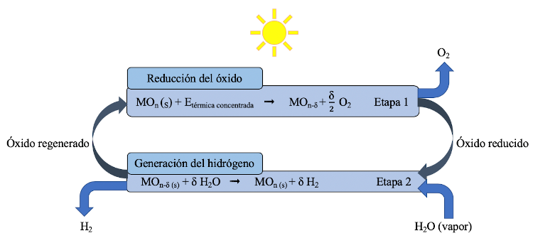 Para llevar a cabo la descomposición térmica del agua en sus componentes hidrógeno y oxígeno con conversiones significativas, son necesarias temperaturas superiores a 2500ºC. Además, se necesitan técnicas que eviten la recombinación del hidrógeno y el oxígeno a las elevadas temperaturas de operación (3). Sin embargo, mediante los ciclos termoquímicos también se puede conseguir la descomposición del agua en sus componentes, y trabajando a menores temperaturas. En la figura 1 se muestra el esquema de un ciclo termoquímico basado en óxidos metálicos (MOn). En la primera etapa del ciclo, el óxido es calentado con la energía solar de concentración produciéndose su reducción térmica acompañada de la producción de oxígeno. En la segunda etapa del ciclo, el óxido reducido (MOn-δ) reacciona con agua, produciendo hidrógeno y regenerando el óxido inicial. De esta manera, el hidrógeno y el oxígeno se obtienen en dos corrientes separadas, evitando su recombinación.