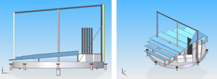El SunDial es un colector Fresnel rotatorio que consiste en una plataforma horizontal, que rota alrededor de un eje vertical. Los espejos concentradores primarios se encuentran instalados sobre la plataforma rotatoria, tienen sección circular y son paralelos al receptor, paralelo a su vez al diámetro de la plataforma, tal y como se observa en la figura 2.