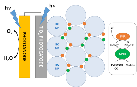 Una estrategia revolucionaria que combina la biocatálisis enzimática con foto-electroquímica apareció recientemente, donde en lugar de utilizar directamente los electrones fotoexcitados para reducir un compuesto como CO2 o protones, se diseñó un bioelectrodo diferente [Morello, 2019]. En concreto se diseñó un electrodo nanoestructurado con nanopartículas de óxido de estaño dopado con indio (ITO), que forma una retícula sobre un electrodo de titanio. El trabajo presenta dos ventajas sobre los sistemas de reducción directa de CO2. En primer lugar, los recovecos que deja el electrodo sirven para facilitar el nano-confinamiento y la compartimentalización de los biocatalizadores, emulando una de las principales características de las células vivas: un principio clave para asegurar los procesos catalíticos en cascada. De ese modo se acelera y se aumenta la eficacia de los procesos enzimáticos concatenados gracias al aumento de concentración a nivel local, de modo que la distancia de difusión de reactivos y productos sea muy corta. De este modo, cargando un electrodo con nanopartículas de ITO y las enzimas ferredoxin-NADP+ reductasa (FNR) y malato-NADP+ oxidorreductasa (MNO) consigue reducir el espacio para la difusión del NADPH, facilitando su ciclo catalítico. En segundo lugar, en el trabajo se evita la diversidad de productos que acarrea la fotorreducción del CO2 dado que se forma, en primer lugar, NADPH a partir de NADP+ gracias a la FNR, que toma los electrones excitados para hacer dicha reducción; y el NADPH es utilizado por la MNO para formar un enlace carbono-carbono entre el piruvato y el CO2, dando lugar a malato. El método además permite trabajar en concentraciones catalíticas de NADPH, un cofactor de precio elevado.