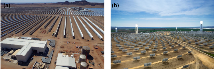 Figura 1. Plantas solares de concentración construidas por Abengoa. a) Planta Xina Solar One con tecnología cilindro parabólica construida en Sudáfrica. b) Plataforma solar de Sanlúcar con tecnología de torre.