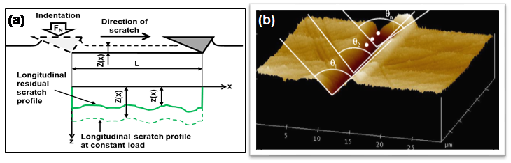 Figura 2. Ensayos de nanorayado: una punta de diamante se desplaza por la superficie del recubrimiento bajo la acción de una carga normal, generando un surco en el material. a) Esquema del ensayo. b) Imagen obtenida mediante microscopía de fuerzas atómicas del surco generado.