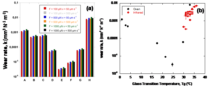 Se midió la tasa de desgaste de pinturas refractarias fabricadas siguiendo diferentes tratamientos térmicos. Los resultados muestran una gran influencia de las condiciones de fabricación en la tasa de desgaste (Figura 3a). Por otra parte, la durabilidad de las pinturas se correlaciona con su temperatura de transición vítrea (Figura 3b). En consecuencia, las prestaciones de los recubrimientos utilizados pueden mejorarse eligiendo adecuadamente las condiciones de aplicación de las pinturas [2].