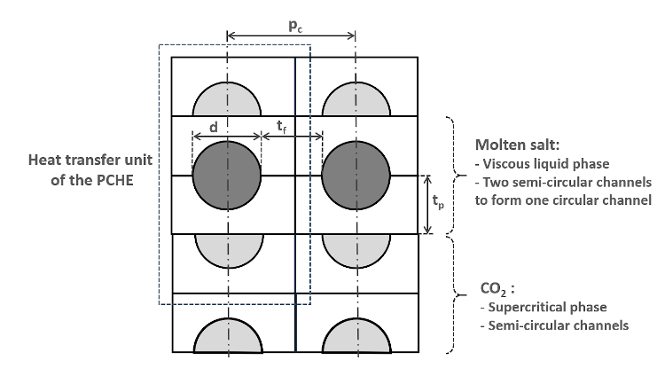 La solución propuesta es un intercambiador de calor en el que se enfrenten dos placas impresas del clásico PCHE, de tal forma que el canal destinado a la sal sea un canal cilíndrico, manteniendo la sección semi-cilíndrica para el CO2, tal y como se muestra en la figura 3.