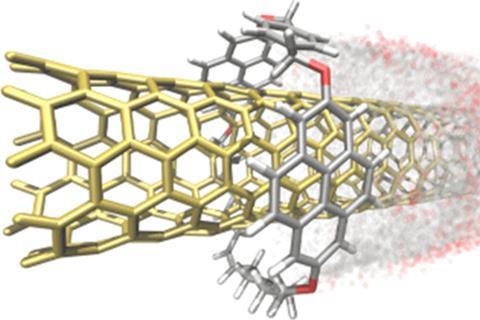 Como alternativa, los investigadores han diseñado un enfoque computacional, construyendo modelos de campo de fuerza de dinámica molecular para las estructuras entrelazadas mecánicamente y llevando a cabo una serie de simulaciones. ‘Hemos observado que, en sólo cinco nanosegundos, los macrociclos se deslizan por un nanotubo de carbón de 50Å,’ indica Pérez. ‘Además, los anillos giran alrededor del tubo, es decir, como nuestro planeta, rotan y giran.’ Para demostrar este comportamiento de tipo pirueta, Pérez y su equipo han decorado los nanotubos con átomos falsos, que han servido como referencia para calcular los ángulos de rotación. ‘Durante los citados cinco nanosegundos, los macrociclos rotan 1.56 veces,’ añade.