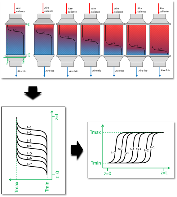 Las diferentes formas de almacenar la energía térmica se pueden clasificar en almacenamiento de calor sensible, que se materializa en el incremento de temperatura del material de almacenamiento, calor latente, donde el material cambia de fase para absorber y ceder energía térmica y almacenamiento termoquímico, que consiste en aportar y recuperar calor mediante reacciones químicas reversibles. Así mismo, cada tipo de almacenamiento incluye diversos sistemas y tecnologías [1]. Entre ellos, este artículo se basa en los lechos fijos o empaquetados para almacenamiento de calor sensible en partículas sólidas sólido, usando aire como fluido de transferencia térmica. Serán denominados ASPB por su acrónimo en inglés: Air Solid Packed Bed.  En términos generales, un ASPB es un contenedor o tanque relleno de partículas sólidas que permanecen fijas en el interior del tanque. Para cargar el sistema de almacenamiento, se hace pasar una corriente de aire caliente por la zona superior que atraviesa el lecho y sale por la parte inferior. La descarga y recuperación del calor almacenado se realiza cambiando el sentido del flujo de aire: entrará fría por la zona inferior y saldrá caliente por la superior. Los distintos mecanismos de transferencia de calor que tienen lugar durante los procesos descritos y mientras el tanque permanece cargado estáticamente, hacen que la energía térmica se acumule en el lecho de partículas formando lo que se denomina termoclina. La termoclina es una zona de transición entre las temperaturas máxima (Th) que corresponde con la zona más alta del tanque y mínima (Tc) que corresponde con la zona más baja. Se forma un gradiente entre ambas temperaturas que se desplaza en altura conforme el tanque se carga o se descarga. En la Figura 1 se describe gráficamente el proceso de carga de un ASPB. Los esquemas de la parte superior de la imagen representan la posición de la termoclina en diferentes momentos del proceso de carga. En cada uno de ellos, se ha dibujado la curva temperatura-altura (T-z). A medida que el tiempo avanza y el proceso de carga evoluciona, la termoclina se desplaza hacia abajo hasta llegar a la zona inferior del tanque, momento de máxima carga. El proceso de descarga conllevaría el movimiento opuesto de la termoclina. Las curvas T-z se han agrupado en los gráficos siguientes, primero tal y como aparecen en el esquema superior y después cambiando la posición de los ejes para una mejor visibilidad y compresión. Este último tipo de gráfico es el que habitualmente se emplea para describir la evolución de una termoclina con el tiempo. Cuanto más estrecha sea la zona de transición entre las zonas de temperatura caliente y fría, la eficiencia exergética del sistema aumentará porque la cantidad del calor aprovechable a la temperatura máxima será mayor. La termoclina avanza a una velocidad que viene determinada por el máximo de la pendiente de las curvas T-z, es decir, el punto de inflexión de dichas curvas. Esa velocidad proporciona información del tiempo requerido para que el sistema de almacenamiento se cargue o se descargue completamente [3].