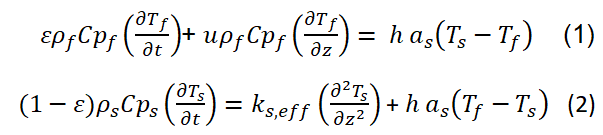 Los prototipos de investigación permiten estudiar la formación y evolución de la termoclina mediante la obtención de datos de temperatura en diferentes alturas y a lo largo del tiempo. Sin embargo, la contribución del propio tanque al comportamiento térmico bien sea por el calor que almacena en las paredes o por las pérdidas que puedan ocurrir a su través, es mucho más importante en dispositivos de menor escala y se hace despreciable cuando la relación entre el volumen de relleno y el volumen de las paredes es muy elevada. Las simulaciones de ASPB suelen consistir en la resolución de un balance de calor aplicado, bien al relleno y al aire por separado, o bien, en algunos casos, a ambas fases actuando como una fase efectiva. Si el coeficiente de transferencia de calor por convección entre el sólido y el aire es elevado, la asunción de una única fase puede ser una simplificación aceptable. El balance de energía aplicado al sólido y al aire por separado tendría la forma indicada en las Ecuaciones 1 y 2, a las que se les podría añadir términos adicionales para contabilizar otros fenómenos como, por ejemplo, pérdidas de calor a través de las paredes del tanque.