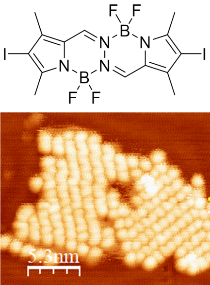 Es por ello que el grupo ESISNA se unió al proyecto FotoArt-CM. Dentro de este marco, el grupo ESISNA, en colaboración con el grupo IMDEA-E (IMDEA Energía), está tratando de utilizar las magníficas posibilidades que ofrece la Síntesis en Superficie a la hora de crear nanoestructuras de precisión atómica para sintetizar redes bidimensionales basadas en colorantes de la familia de las BODIPYs, que posteriormente será testadas en sistemas de electrofotocatálisis. Para ello, el grupo IMDEA-E ha sintetizado unos precursores de BOPHY funcionalizados con halógenos para que el grupo ESISNA los pueda depositar y activar térmicamente en superficie, formando así nanoestructuras de gran calidad. Los primeros resultados obtenidos son esperanzadores, ya que demuestran que somos capaces de depositar, activar y acoplar las moléculas de BOPHY dando lugar a oligómeros en superficie (ver Figura 1). Esta investigación sigue en curso y esperamos que dé lugar a interesantes resultados en los próximos meses, suponiendo un claro avance en la estrategia de ESISNA de llevar los nanomateriales “perfectos” crecidos bajo condiciones altamente controladas hacia aplicaciones enfocadas a retos sociales.