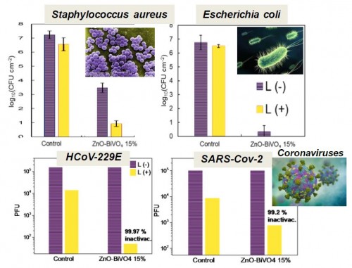 La elevada eficacia viricida y bactericida se debe a la reducción efectiva de la recombinación de pares de electrones-hueco fotogenerados y se correlaciona con una mayor generación de radicales HO• (especies ROS). Estas especies ROS fotogeneradas son las causantes del daño en la membrana celular y producen un alto estrés oxidativo intracelular en las bacterias.