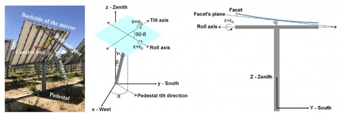 Figura 1: Heliostato del campo solar de IMDEA Energía (izquierda) y esquema con las posibles desalineaciones de su estructura (centro y derecha)