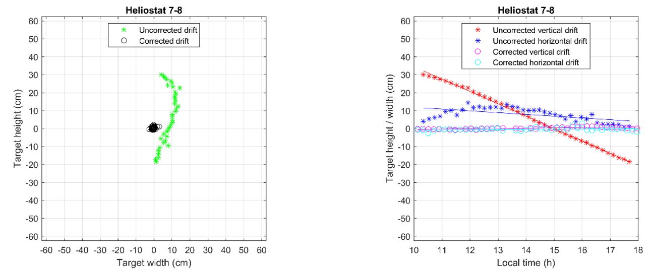 Figura 2: Curvas de deriva de uno de los 7 heliostatos antes y después de corregirla. La imagen de la izquierda muestra la deriva sobre el receptor y la imagen de la derecha muestra sus dos componentes, horizontal y vertical, en función del tiempo