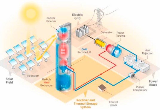 Figura 1: Esquema de una planta de energía solar de concentración con receptor de partículas y ciclo de CO2 supercrítico [1]