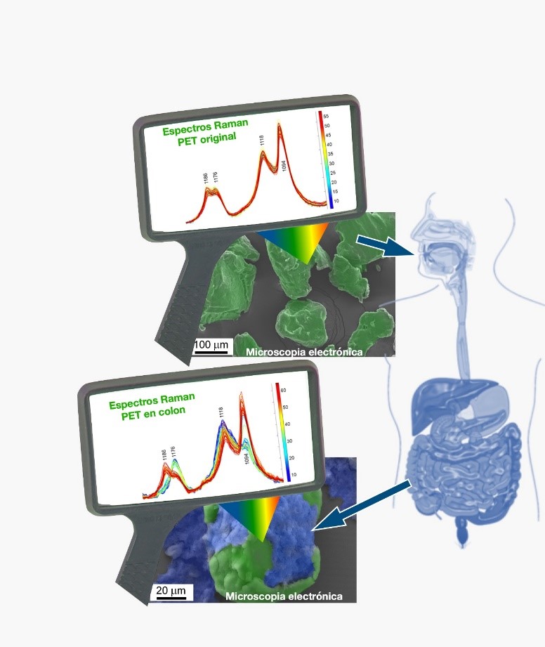 Por primera vez, se demuestra que el PET micrométrico ingerido sufre biotransformaciones durante su paso por el tracto gastrointestinal, llegando al colon con modificaciones estructurales significativas; dichas transformaciones del PET son concomitantes con una reducción en la diversidad bacteriana de la microbiota colónica, especialmente en el colon distal. En concreto, se redujo la relación Firmicutes/Bacteroidetes y la abundancia relativa de géneros conocidos por su efecto positivo sobre la salud, mientras que aumentaron otros grupos microbianos intestinales relacionados con la actividad patógena. Además, el análisis de microplásticos a nivel colónico mostró la adhesión de la microbiota a la superficie del PET, lo que no se había demostrado antes, favoreciendo así la formación de biopelículas. Esta investigación nos ayuda a comprender uno de los posibles efectos de la ingesta de microplásticos sobre el tracto digestivo y la microbiota, dada la exposición crónica a estas partículas a través de la dieta. Los resultados sugieren que la digestión gastrointestinal podría afectar a los microplásticos y que su consumo continuado podría alterar la homeostasis intestinal humana y, en consecuencia, la salud. El estudio también sugiere la posible existencia de taxones en microbiomas humanos que podrían degradar los plásticos. La comprensión de estos mecanismos y factores, que recién comienzan a ser investigados, contribuirá a evaluar el riesgo de los microplásticos si pueden permanecer en el cuerpo humano y acumularse en órganos y tejidos.