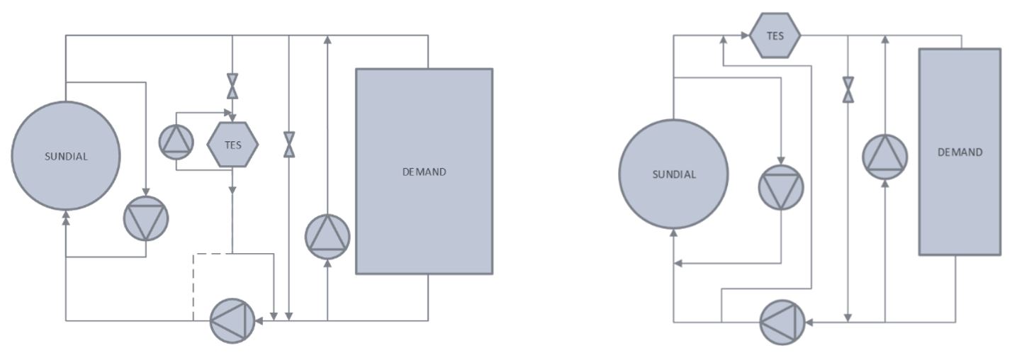 Una de las primeras tareas del proyecto ha sido el diseño de la integración y dimensionamiento de los distintos elementos del ‘concepto ASTEP’ (captador, almacenamiento térmico y demanda). Para optimizar los resultados en la operación de los dos futuros pilotos, se desarrolló un modelo cuasi-estatico que permitió el análisis de la influencia que tenía en la producción diversas variables de diseño (tamaño de la demanda, tamaño del almacenamiento, etc), así como dos esquemas de integración diferentes: uno en el que el almacenamiento térmico se sitúa en paralelo al captador solar y uno en el que se sitúa en serie (Figura 1).