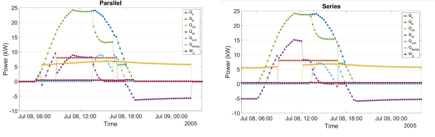 Figura 2. Resultados de la simulación de un día de verano (8 de julio) para el esquema en paralelo (izquierda) y en serie (derecha)