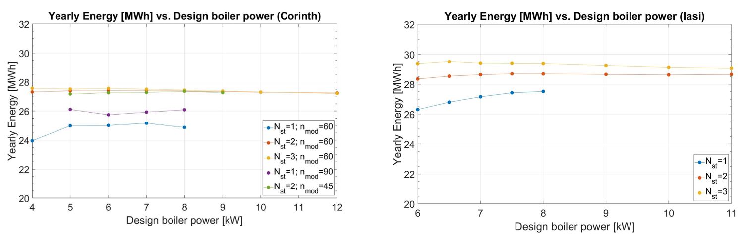 Para ambas localizaciones, cuando se consideraba solo un tanque, la potencia de diseño del generador de vapor estaba limitada a 8 kW, lo cual no sucedía en el resto de casos. La diferencia entre 2 y 3 tanques es despreciable en ambas localizaciones. Los resultados muestran que tanto en Corintio como en Iasi, los diseños escogidos (N=2, mod=60, Qb,dis=8 kW para Corintio; N=2, Qb,dis=7 kW para Iasi) permiten alcanzar valores de producción anual por encima de los 25 MWh, ofreciendo además flexibilidad en la operación.