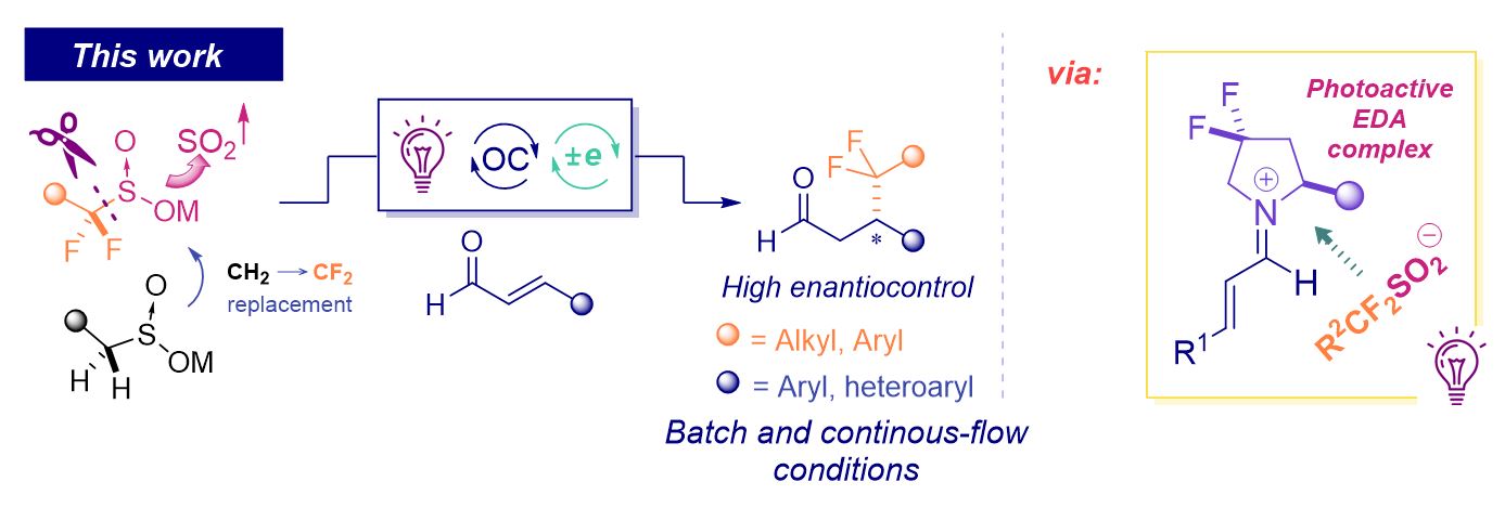 Abstract: The generation of sulfonyl radicals has long been known as a flexible strategy in a wide range of different sulfonylative transformations. Meanwhile their use in alkylation processes has been somehow limited due to their inherent difficulty in evolving to less-stable radicals after sulfur dioxide extrusion. Herein we report a convenient strategy that involves gem-difluorinated sulfinates as an “upgrading-mask”, allowing these precursors to decompose into their corresponding alkyl radicals. The electron–donor character of sulfinates in the formation of an electron donor–acceptor (EDA) complex with transient iminium ions is displayed, achieving the first example of a stereocontrolled light-driven insertion of gem-difluoro derivatives into unsaturated aldehydes. This methodology is compatible with flow conditions, maintaining identical levels of enantiocontrol.