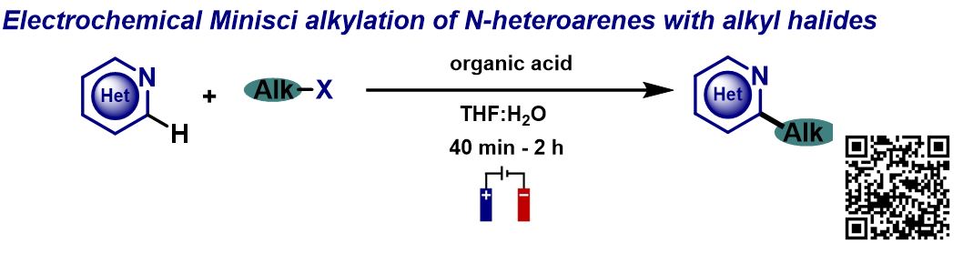 Abstract: Herein, we report, a general, facile and environmentally friendly Minisci-type alkylation of N-heteroarenes under simple and straightforward electrochemical conditions using widely available alkyl halides as radical precursors. Primary, secondary and tertiary alkyl radicals have shown to be efficiently generated and coupled with a large variety of N-heteroarenes. The method presents a very high functional group tolerance, including various heterocyclic-based natural products, which highlights the robustness of the methodology. This applicability has been further proved in the synthesis of various interesting biologically valuable building blocks. In addition, we have proposed a mechanism based on different proofs and electrochemical evidence.