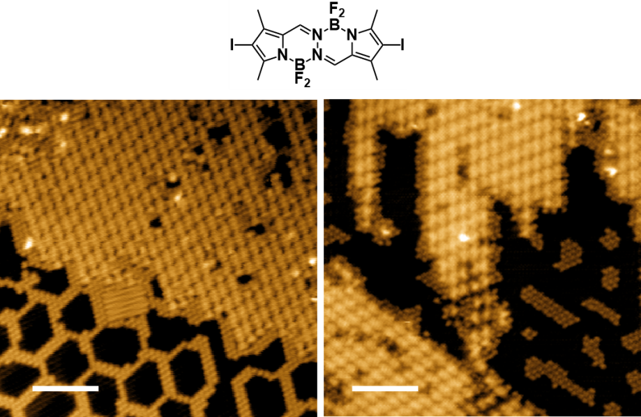 Figura 1 – (Panel superior) Esquema del precursor molecular empleado. (Panel inferior) Imágenes de STM de alta resolución mostrando estructuras basadas en BOPHY en Au (111) (izquierda) y Ag (111) (derecha). Barra de escala: 5nm