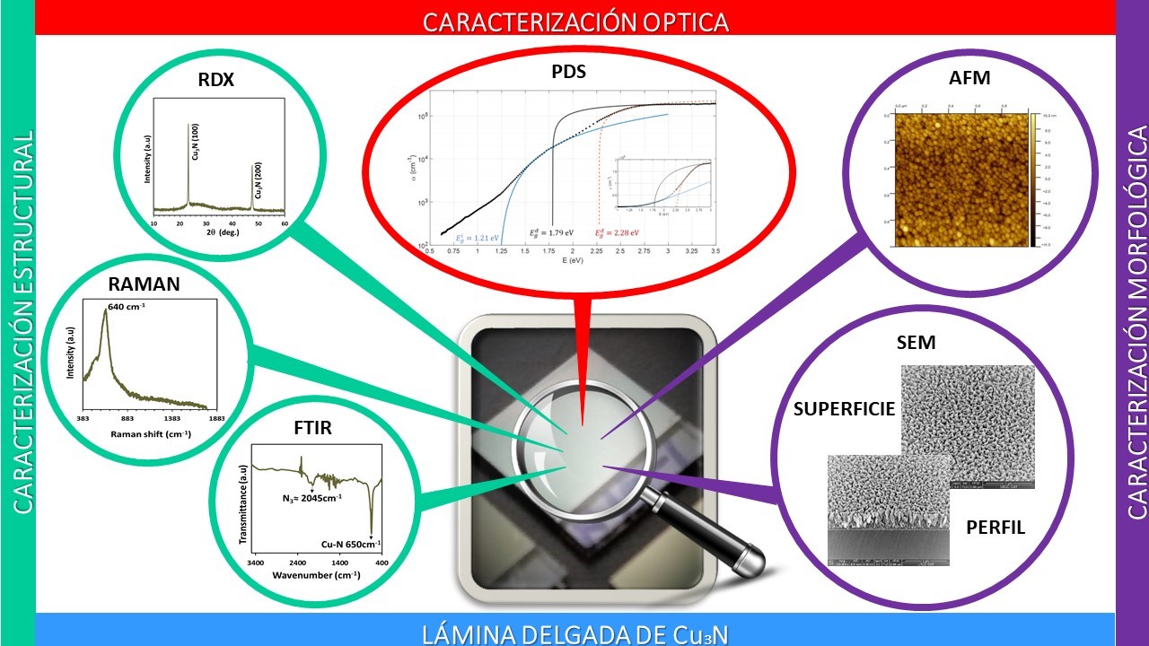 Figura 2. Resumen de los resultados obtenidos de la caracterización de láminas delgadas de Cu3N fabricadas por pulverización catódica reactiva en condiciones de bajo impacto medioambiental.