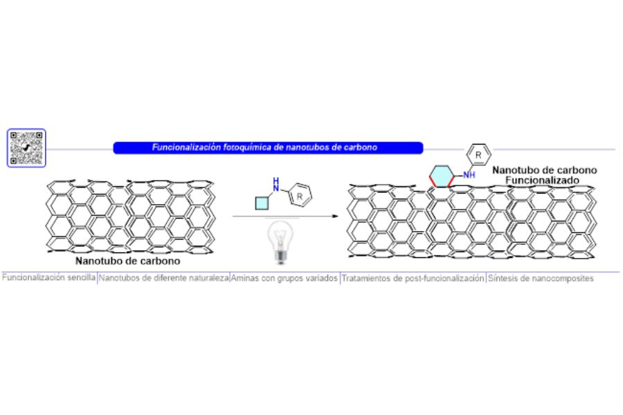 Los nanotubos de carbono son alótropos del carbono compuestos de átomos de carbono enlazados formando un cilindro de dimensiones nanométricas. Son resistentes, conductores y con gran área superficial, lo que los convierte en excelentes candidatos para el desarrollo de materiales avanzados. Para ello, se suelen funcionalizar, bien mediante el desarrollo de la química superficial oxigenada o bien empleando cicloadiciones con el esqueleto insaturado. Entre estas, destacan la reacción de Bingel, la reacción de Diels-Alder, el atrapamiento de especies de benzino generadas por procesos de eliminación térmica o la cicloadición dipolar 1,3 con iluros de azometino entre otras. Sin embargo, la existencia de métodos que empleen la luz visible como vector químico para su modificación sigue siendo muy escaso. Es por ello que el grupo de investigación, basándose en la reactividad térmica de los nanotubos de carbono anteriormente descrita, se planteó el desarrollo de métodos fotoquímicos empleando especies capaces de reaccionar con moléculas insaturadas, como por ejemplo el catión radical distónico que se obtiene al iluminar una aril-ciclobutil amina en presencia de un fotocatalizador adecuado.